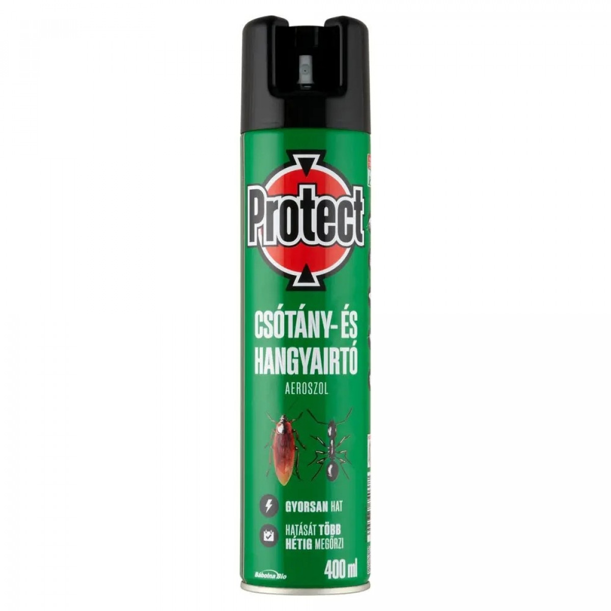 A Protect csótány- és hangyairtó aeroszol a rovarok búvóhelyeire és vonulási útjatira kiporlasztva egyszerű használatot és azonnali, 6 héten át tartó ölőhatást biztosít. A termék az összes rejtett életmódú rovar (csótány, hangya stb.) ellen hatékony védelmet nyújt. Emberrel és melegvérű állatokkal szemben ártalmatlan.