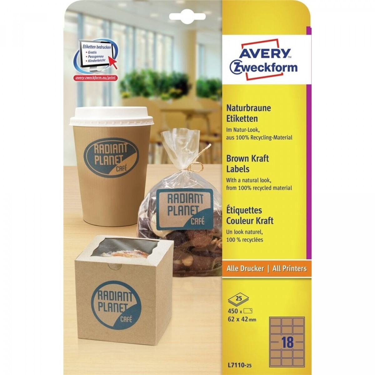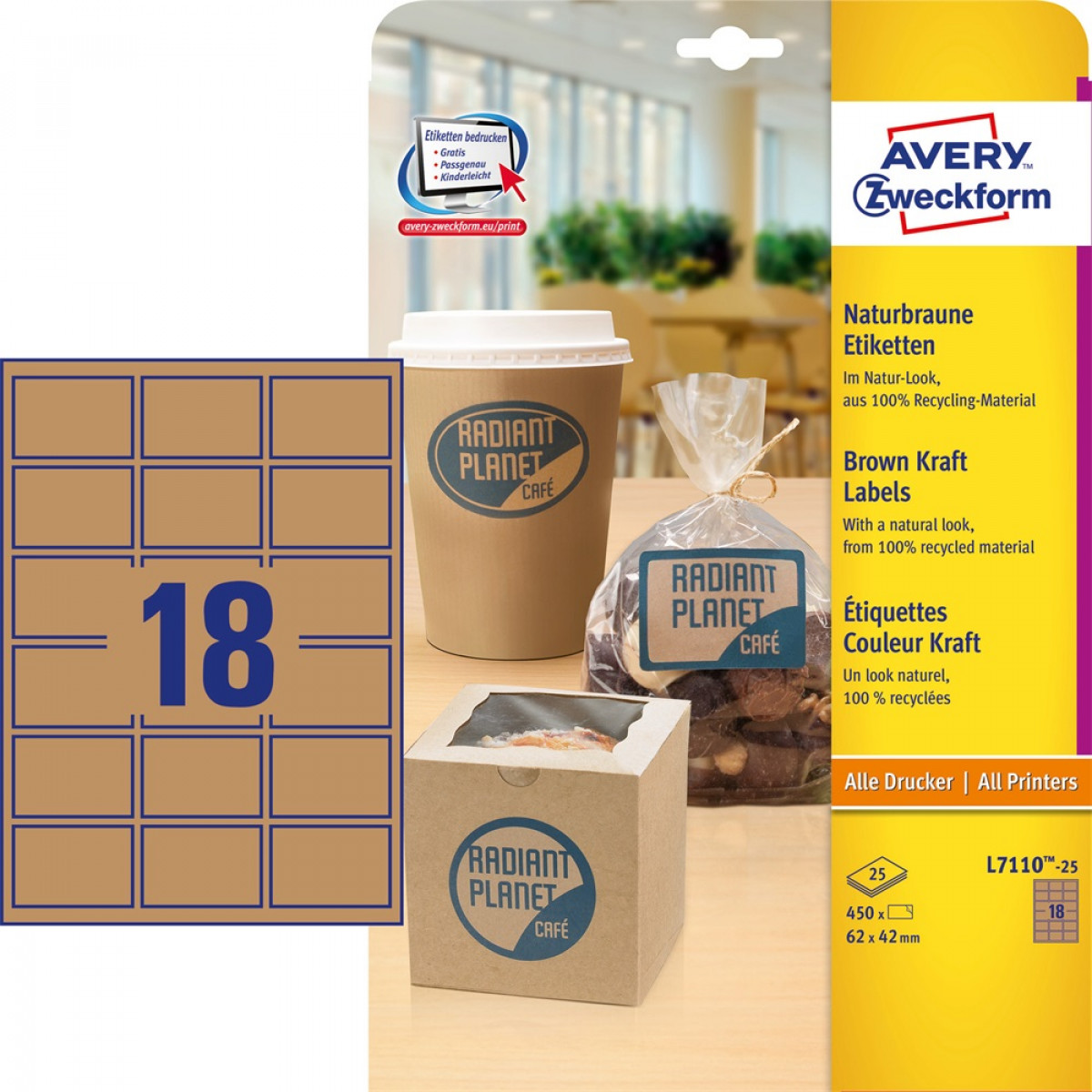 Etikett címke, 62 x42mm, környezetbarát 18 címke/lap, 25 lap/doboz, Avery barna bemutatása